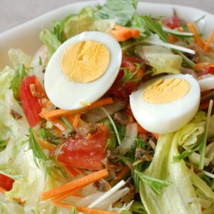 ③器に盛り付け、ゆでたまごを切ってサラダの上にトッピングすれば完成。