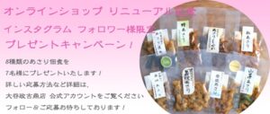オンラインショップのリニューアルを記念して、インスタグラムのフォロワー様限定プレゼントキャンペーンを開催いたします! 豪華8種のあさり佃煮セットが、7名様に当たるプレゼント企画です。 応募に関する詳細は、大…