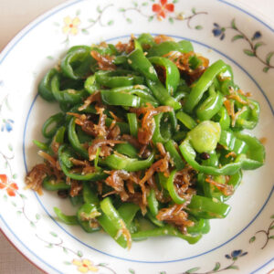 <材料> ちりめん山椒 約30g ピーマン 1袋(約5個くらい) 生姜 少々 ごま油 適量 【作り方】 1.ピーマンは縦半分に切り、種を取って小口から5mm幅の細切りにする。 2.鍋にごま…