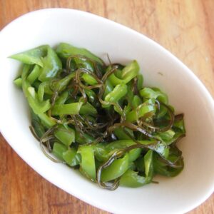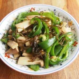 <材料> 青とうがらし 2本 汐ふき昆布 大さじ1 【作り方】 1.青とうがらしをタテ半分に切り、タネを取る。 斜めの薄切りにし、ラップをしてレンジで1分強あたためる。 2.あたたかいうちに、汐ふき昆布を…